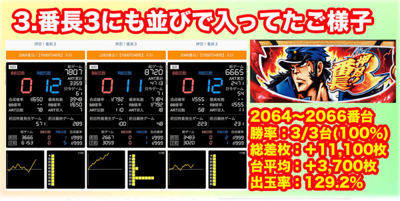 3台並びは7か所ありましたが、ココでは前述した「スマスロ北斗」の3台並び×2か所と「キングハナハナ」の3台並び×1か所を除いた4か所を紹介します!