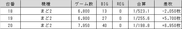 まどか叛逆の3台並びは若干不発も出ている台は綺麗な右肩上がりで不発の台も高設定のヒキ弱といったデータでした。