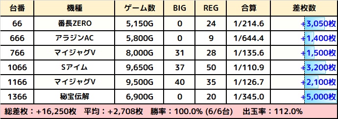末尾66☆彡6台・平均差枚1692枚彡☆