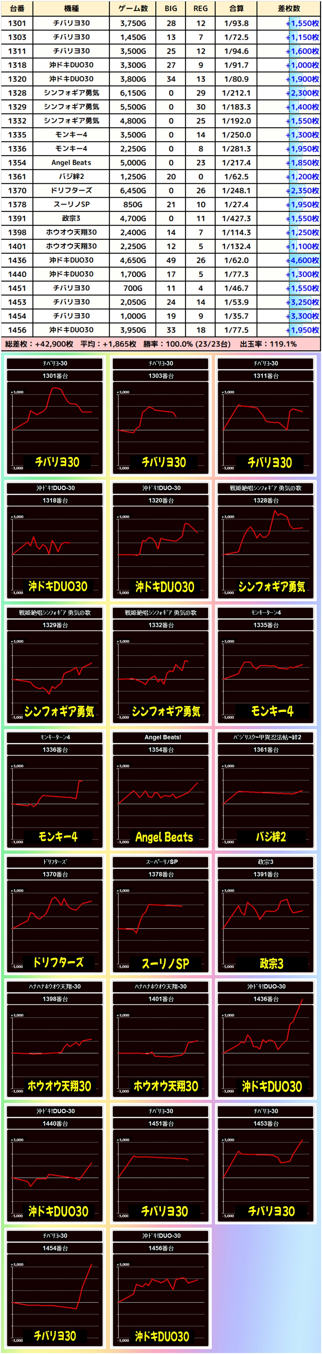 打ち込み不足でマイナスの台もありましたが、平均+1600枚以上と上々の結果に!